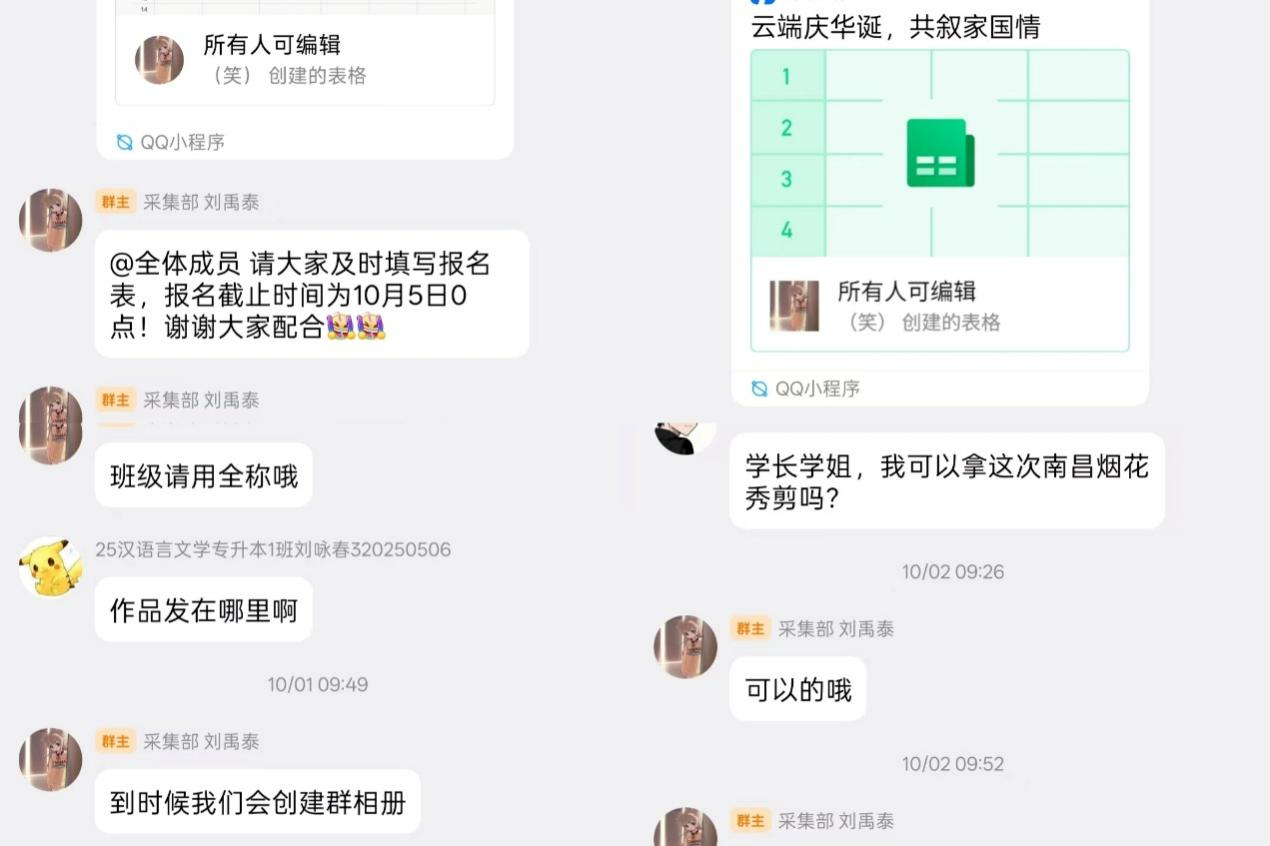 为庆祝中华人民共和国成立76周年,9月30日,由Beat365亚洲版官网组织开展的“云端庆华诞,共叙家国情”——“我的家国记忆”短视频征集活动正式拉开帷幕,此次活动采用线上模式,面向全校学子发出诚挚邀约,鼓励大家用镜头捕捉时代变迁下的个体感悟,用影像铭刻那份深植于心的家国情怀。活动伊始,为保障“云端庆华诞,共叙家国情”活动的顺利开展,准备工作从QQ建群、名单统计、技术保障、作品收集等多方面精心规划。在工作人员的引导下,参与活动的同学们踊跃分享个人作品,积极讨论活动内容,同时在活动持续期间内工作人员及时地为各位同学解答相关疑惑。本次活动通过线上交流与视频分享展现了家是最小国国是千万家,用青春的视角,为时代留影,为家国存证,携手谱写属于我们这一代人的家国记忆华章。活动鼓励同学们走出课堂,关注社会变迁,感受时代脉搏,通过独特的青年视角和创新的视听语言,挖掘并展现那些蕴含在日常生活里、体现在城乡风貌变化中、凝聚在民族情感深处的家国故事。(图/采集部文/符思鑫初审/龙少帅二审/黄金标终审/江建华)
