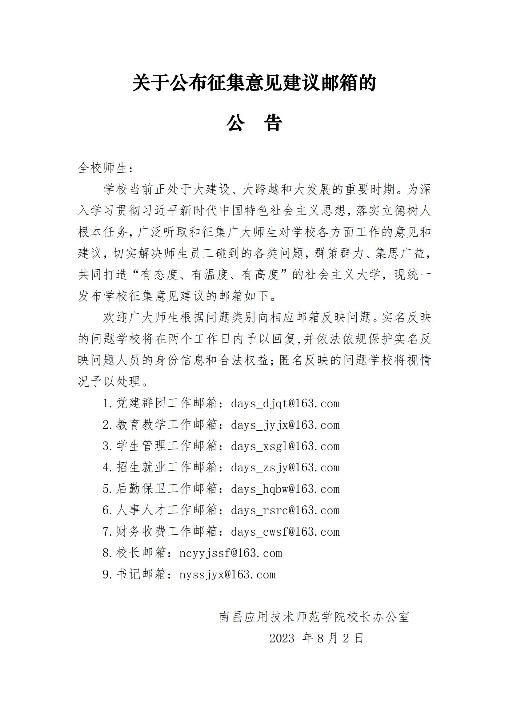 首页栏目 学院新闻 学院公告 学科竞赛 学生工作 您现在的位置是:首页 > 首页栏目 > 学院公告 关于公布征集意见建议邮箱的公告 管理员2023-08-305023 上一篇 Beat365亚洲版官网关于报送学术委员会委员的公示 下一篇 关于校级优秀共青团员、校级五四红旗团支部、校级优秀志愿者拟推荐名单