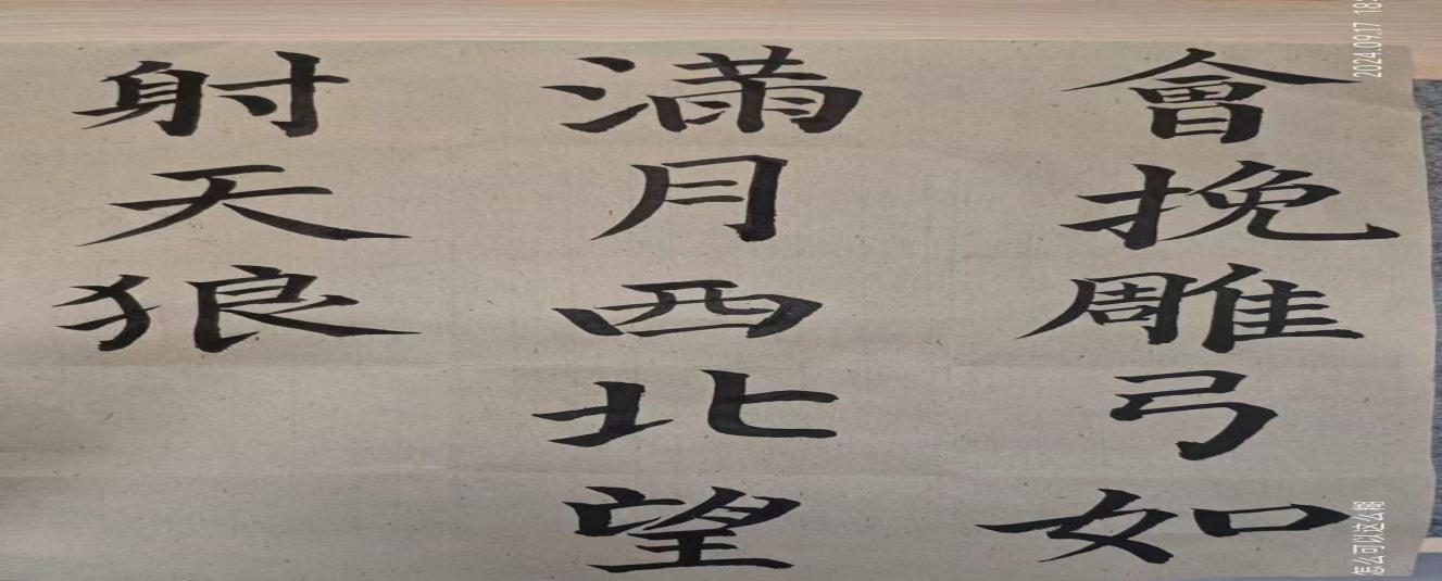活动过程中,同学们展现了极高的参与热情与创造力。一部分同学巧妙地运用便捷的硬笔书法工具,结合现代审美视角,重新演绎了古典诗词的韵味,使传统文化在现代社会中焕发出新的生机与活力。他们的作品既保留了古典诗词的深邃意境,又融入了现代元素的创新表达,展现出了别样的艺术风采,为普通话的语言艺术增添了新的注脚。与此同时,另一部分同学则坚守传统文化的阵地,选用笔墨纸砚这一传统书写工具,以深厚的书法功底,挥洒自如地展现着书法艺术的魅力。这些作品不仅凝固了文字之美,更传递了中华文化的精髓与力量,为普通话宣传周增添了一抹浓厚的文化底蕴。