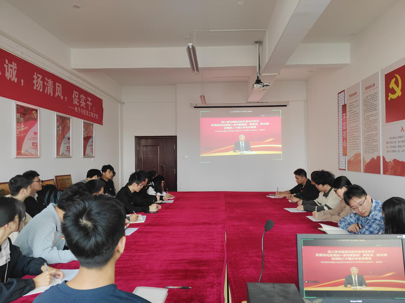 随后,着重就“学习贯彻党的二十届三中全会精神”这一主题展开学习研讨,集中支部党员观看视频课程,深刻理解把握进一步全面深化改革、推进中国式现代化的核心要义、精神实质、时代内涵。在学习过程中,党员们聚精会神,认真记录重点内容。