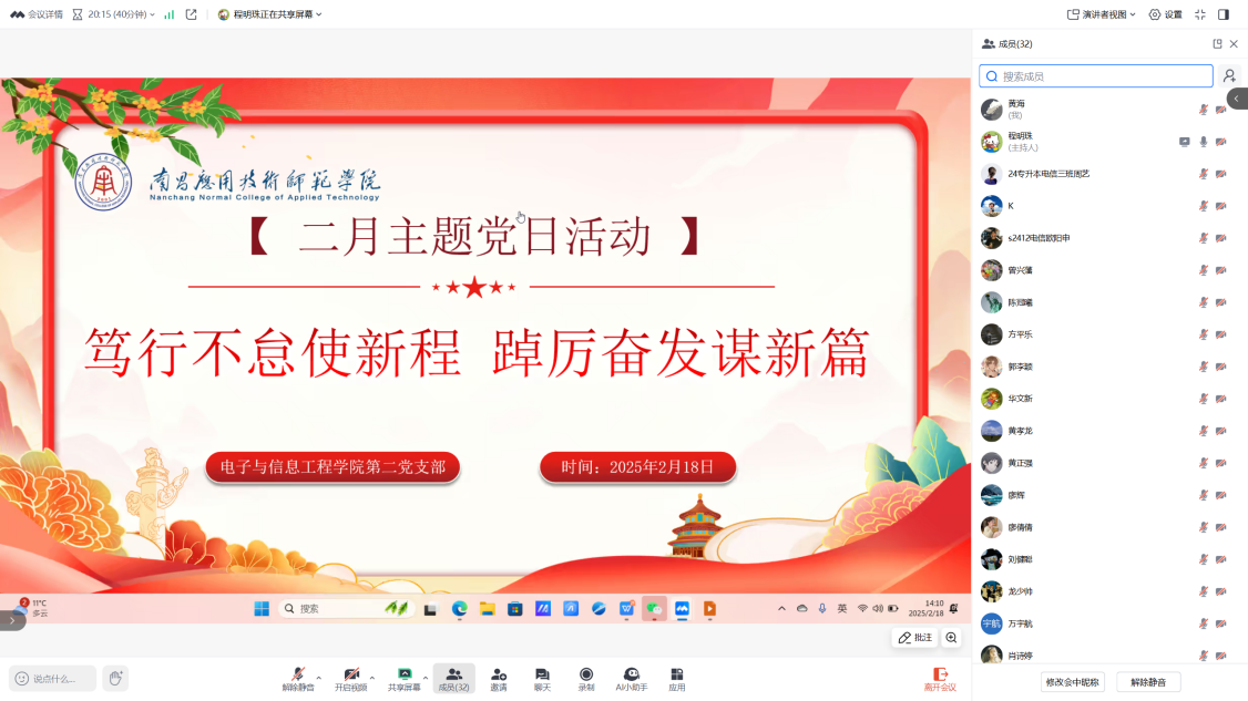为深入学习习近平新时代中国特色社会主义思想和习近平总书记重要讲话精神,激励党员始终以榜样为标杆,提升服务意识,发挥先锋模范作用,Beat365亚洲版官网第二党支部于2月18日在腾讯会议组织开展“笃行不怠使新程,踔厉奋发谱新篇”主题党日活动。