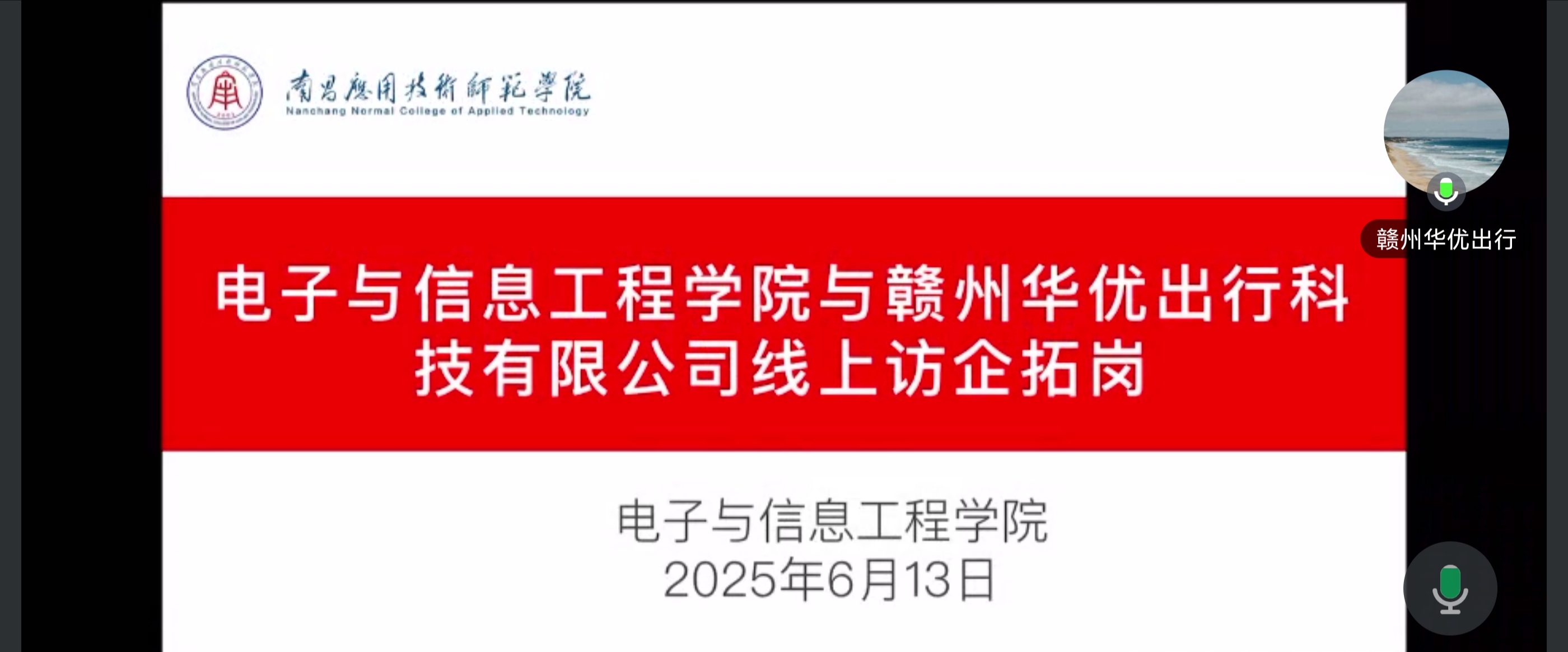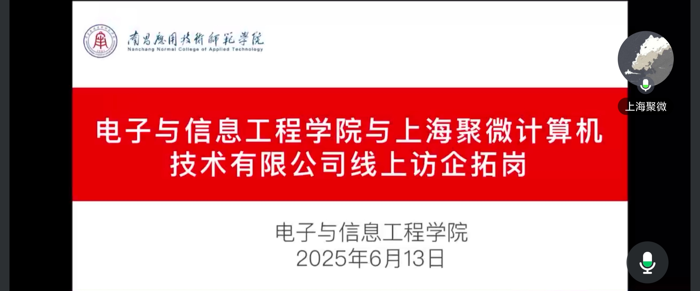 为进一步深化校企协同发展,精准对接企业需求,拓宽毕业生就业岗位,校长助理李少义和院长魏艳平于6月12日与上海聚微计算机技术有限公司、赣州华优出行科技有限公司、杭州航特科技有限公司、江西圆梦会展有限公司、宜春市山腾电子有限公司开展线上交流工作。