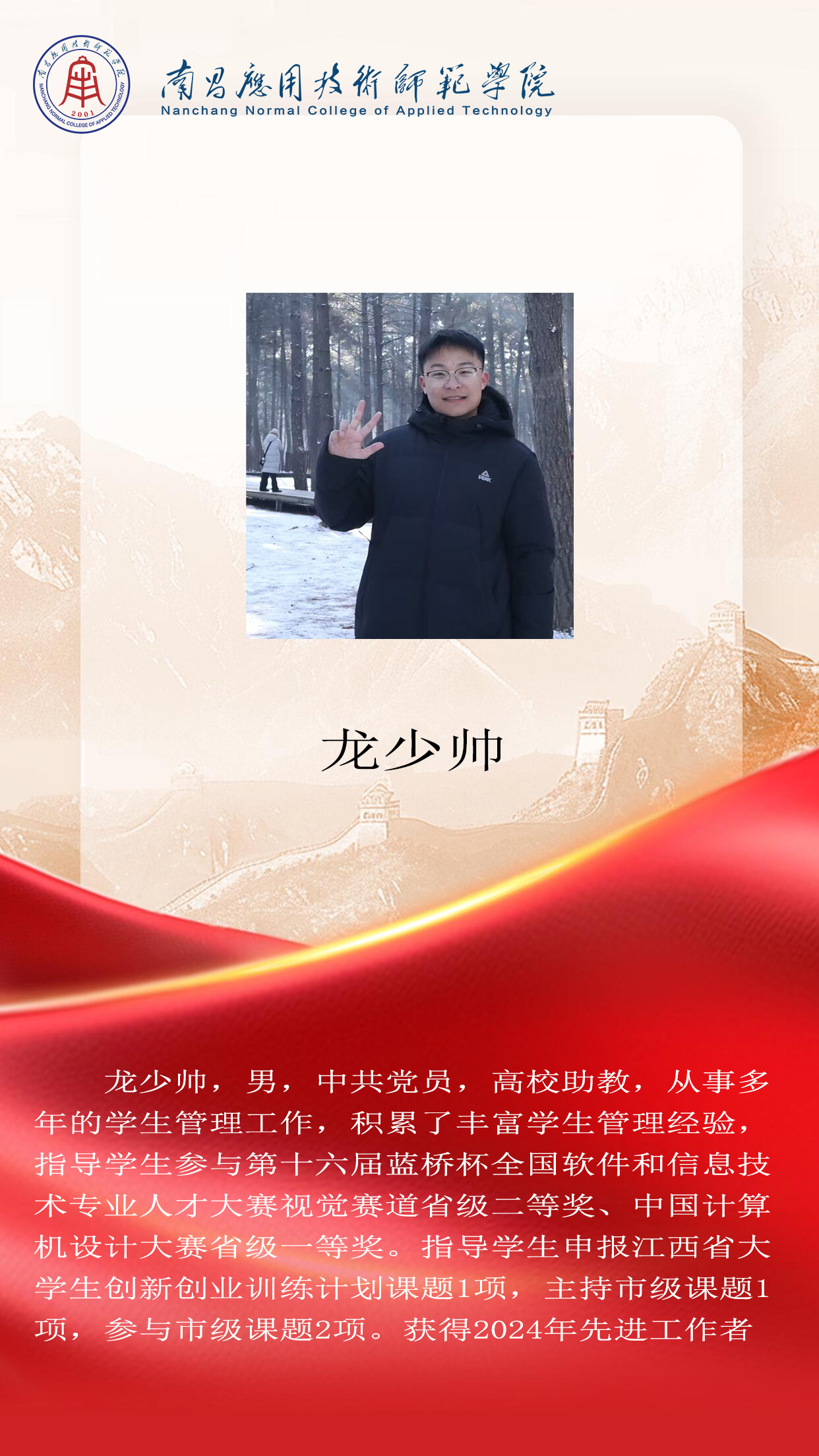 先进典型 优秀毕业生 优秀学生风采 优秀教职工 您现在的位置是:首页 > 先进典型 > 优秀教职工 龙少帅 先进工作者 管理员2025-06-161445 上一篇 刘硕 数字媒体系主任 下一篇 张扬 工程技术系主任