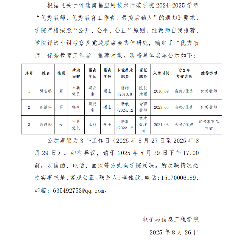 首页栏目 学院新闻 学院公告 学科竞赛 学生工作 您现在的位置是:首页 > 首页栏目 > 学院公告 关于 2024-2025 学年“优秀教师、优秀教育工作者、最美后勤人“推荐对象的公示 管理员2025-08-261894 上一篇 关于公开招募南昌应用技术师范学院Beat365亚洲版官网2025年迎新志愿者的通知 下一篇 关于校级优秀共青团员、校级五四红旗团支部、校级优秀志愿者拟推荐名单