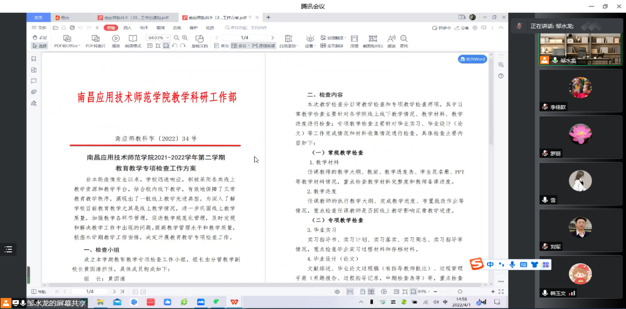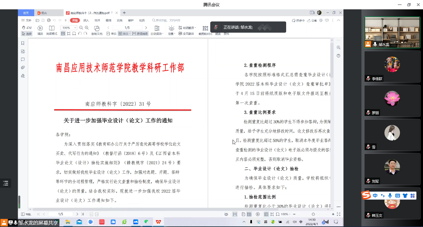会上,邹水龙全文宣读了“关于进一步加强毕业设计(论文)工作的通知”(南应师教科字[2021]31号)、“南昌应用技术师范学院2021-2022学年第二学期教育教学专项检查工作方案”(南应师教科字〔2022〕34 号)等文件,对毕业设计(论文)各个环节的工作进行了重点解读,邹水龙强调,毕业设计(论文)是人才培养重要环节,各教研室主任要提高认识,严格按照教育部、教育厅和学校相关文件要求,加强过程管理,加强督促,确保毕业生毕业设计(论文)质量。随后,与会老师围绕毕业设计(论文)指导、查重、答辩以及教育教学检查等方面工作进行了详细讨论。