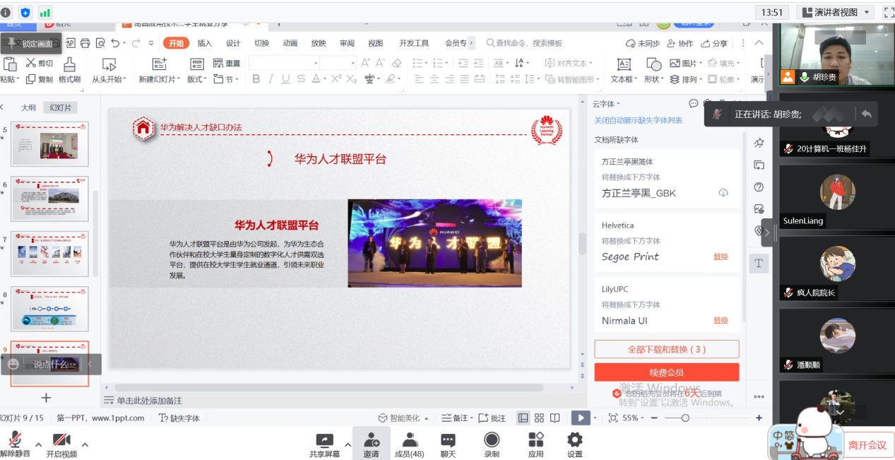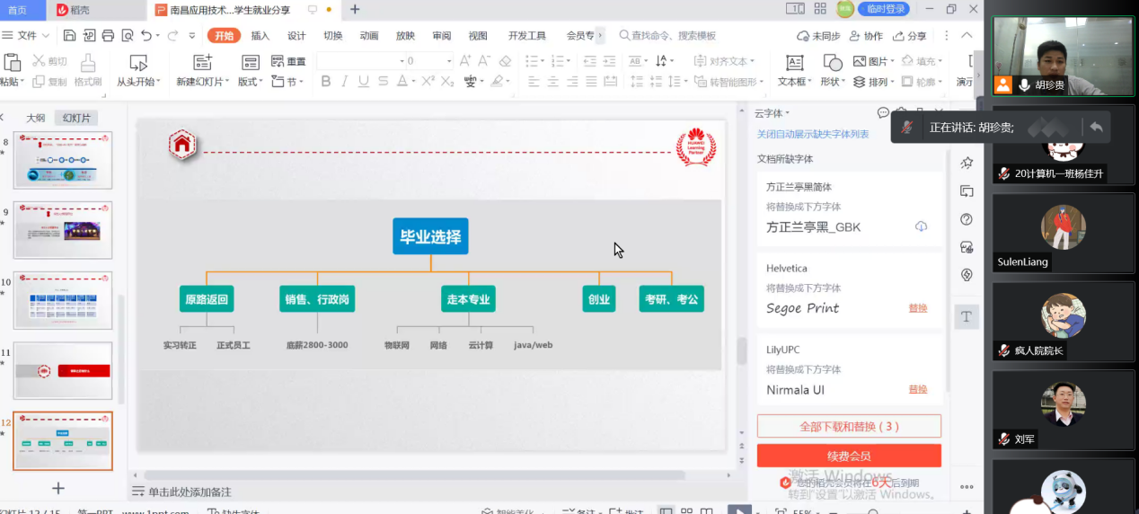 4月27日,华为ICT学院百校行活动—南昌应用技术师范学院毕业生就业分享会顺利举行。因疫情防控需要,分享会线上举行,由合肥宝德网络江西分公司高级院校经理胡珍贵主持。学院院长邹水龙、软件工程教研室主任刘军、各班级辅导员以及18、19级学生共计60余人参加了此次分享会。